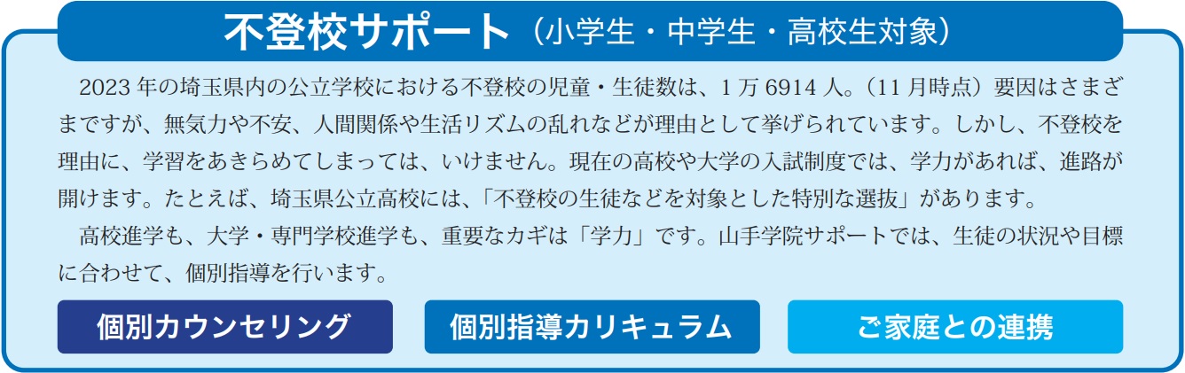現在、在籍している高校で、もし不登校になったときには、すぐに退学するのではなく、在籍した状態でつぎの選択肢を考えてください。退学してしまいますと、その1年を失うことになりますが、在籍した状態での転学であれば、通信制高校の場合、必要な単位を取得することによって、高校3年間で卒業することが可能です。どうしても現在の高校が合わないときは、ぜひ山手学院サポートにご相談ください。埼玉県通信制私立高校をご案内し、卒業・進学につなげていきます。